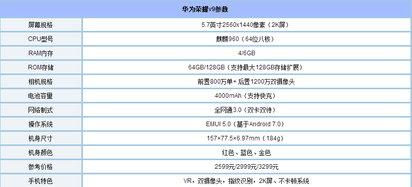 华为荣耀v9硬件配置参数,详情如下所示,参数党必看: