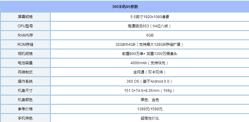 360手机N5标准版:6GB RAM + 32GB ROM,售价1399元;