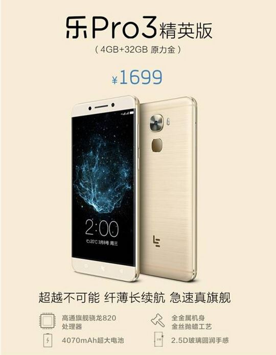 乐视Pro3精英版1699元,4GB+32GB原力金配色版本。