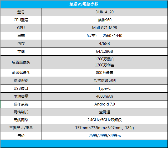 而在配置方面,荣耀V9同样亮点满满,它采用了5.7英寸2K显示屏,搭载了麒麟960处理器,核心频率最高为2.4GHz。最高配备了6GB内存和128GB闪存,电池容量达到了4000mAh,支持Quick Charge快充技术。