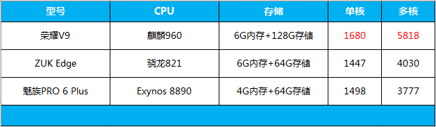 ↑↑↑GeekBench 4 CPU测试,左中右分别是荣耀V9、ZUK Edge和魅族PRO 6 Plus