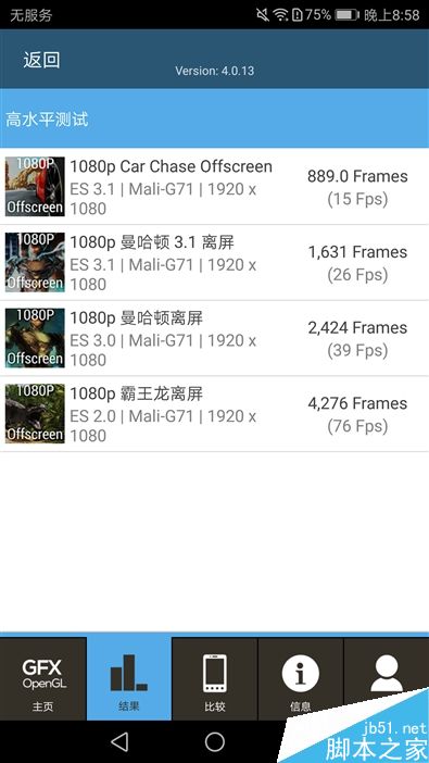 ↑↑↑GFXBench 4 GPU测试中,荣耀V9在赛车、曼哈顿3.1、曼哈顿离屏和霸王龙项目中的成绩分别是15FPS、26FPS、39FPS和76FPS。这个表现说明麒麟960完全可以畅玩各类大型3D游戏,日常应用更是不在话下。