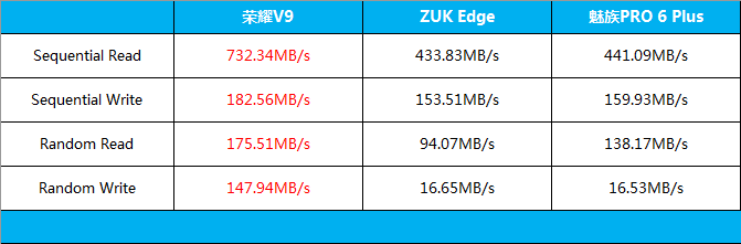 ↑↑↑荣耀V9以绝对领先的成绩超过了对手ZUK Edge和魅族Pro 6 Plus,其中随机写入速度高达147.94MB/s,优势非常明显。