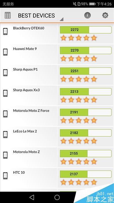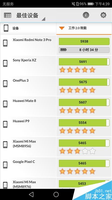 ↑↑↑PCMark工作效能2.0测试中,荣耀V9的成绩位居排行榜第一名(分数越高越好)。