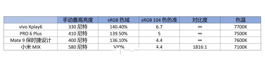 屏幕素质方面,四台机器中手动亮度最高的是小米 MIX,接近 600 尼特,vivo Xplay6 和 Mate 9 保时捷设计则在自动模式下提供了爆发模式;所有对比机型中在色温这一项上都迎合亚洲人的偏好设置成偏冷的 7000K 以上,色域均覆盖超过 100% 的 sRGB 色域,色准方面平均 DeltaE 最低的是小米 MIX,最高的是 Xplay6,表现上都还算不错,但相比 iPhone 7 和三星 Galaxy S7 那样的色准还有一定的距离。