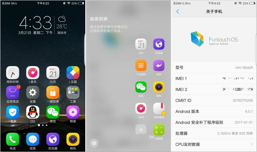 Xplay6 搭载的则是 Funtouch OS,界面上没什么特别的地方,整体就是类 iOS 化,配合曲屏的特性也像三星一样添加了快捷呼出菜单。Funtouch OS 整体基于 Android 6.0.1 修改而来,包括取消二级菜单、自带 Hi-Fi 音乐播放器等特性和 vivo 其它机器并无二样,与外观设计类似都是针对大众用户的。
