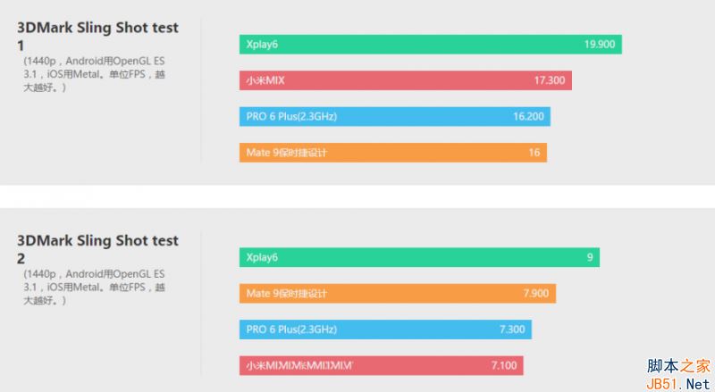 在图形测试项目中,四者互有胜负,差距也是在毫厘之间,让人有些出于意料的是配备骁龙 820 的 Xplay6 在 3D Mark 的高级测试中占据了第一位,比起主频更高的 821 分数更高,不知道 vivo 有没有针对这部分进行优化。由于 Mate 9 保时捷设计默认搭载的是 256G UFS 2.1,所以在读写性能上的优势十分明显。