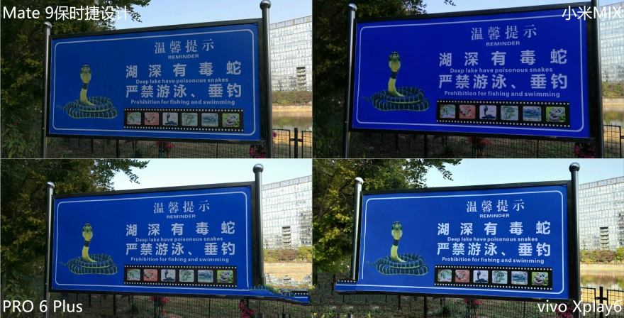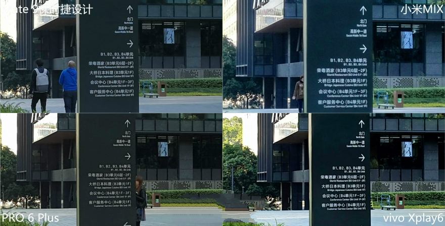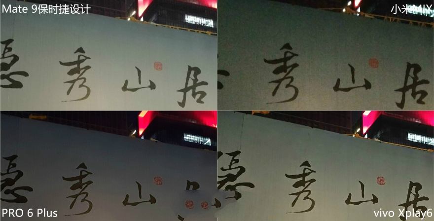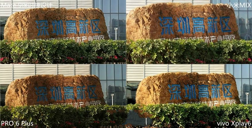 这组对比样张中,四台机器表现最好的是 Xplay6,白平衡、噪点控制以及明暗部分的还原都很出色;PRO 6 Plus 则有点让人出乎意料,除了白平衡方面稍微逊色和有些曝光不足外,其它部分几乎都能与 Xplay6 竞争一下;Mate 9 保时捷设计的表现和 Mate 9 Pro 一致,细节方面表现最好,但标准模式下的白平衡不是很准确;小米 MIX 的样张只能说勉强过关,1600 万像素也没表现出细节上的差距,反而是四机中最差的。