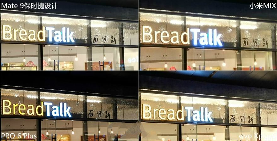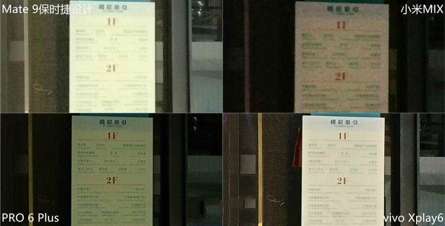 切换到弱光场景,Xplay6 的优势反而更大了,这组样张中只有 Xplay6 的文字较为清晰,噪点的控制也很不错,同时自动将亮度拉高,拍到更多的内容;Mate 9 保时捷设计拍摄该场景时的亮度更高,招牌上的字样勉强能看清,不过由于亮度过高导致白平衡和噪点控制都较弱;PRO 6 Plus 最还原当时的光线环境,不过噪点和涂抹都比较多,基本上看不清较小的文字;小米 MIX 单位面积像素过小的缺点就暴露出来了,与另外三台机器的差距实在过大。