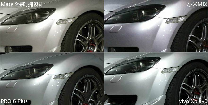 而在车库环境中,PRO 6 Plus 和 Xplay6 的白平衡都比较准确,Xplay6 对于光线的还原更好一些,同时小米 MIX 依旧出现了偏蓝的情况;细节上则是 Mate 9 保时捷设计最好,Xplay6 其次,PRO 6 Plus 和小米 MIX 的涂抹较多;曝光上 Mate 9 保时捷设计偏向过曝,PRO 6 Plus 则偏向欠曝。