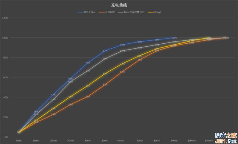 虽然在续航上有些小遗憾,不过 PRO 6 Plus 的充电速度相当暴力,从 5% 到充满 100%,仅需要 1 个半小时左右;Mate 9 保时捷设计则在后期因为涓流充电影响了整个成绩,但是在 1 个小时内 Mate 9 保时捷设计的充电速度是仅次于 PRO 6 Plus 的,可以充到 80% 以上,另外两台机器小米 MIX 和 Xplay6 都不到 80%。四台机器都默认配备快充,所以都能在 2 小时内充满。