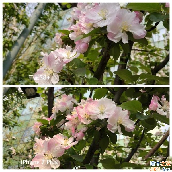 在使用自动模式近距离拍摄室外花朵时,三星S8+与iPhone 7 Plus的表现相差不多,花朵细节与色彩均还原的不错,不过iPhone 7 Plus的背景虚化表现略逊一筹。