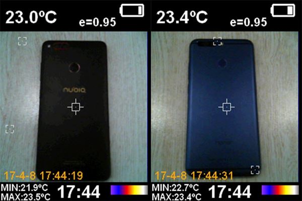 左为努比亚Z17mini,可以看到两款手机的高温点都在左上角的摄像头附近,但努比亚Z17mini的温度更低——充分证明双摄发热是可以控制的!