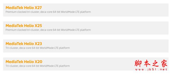 其实 Helio X20、X25、X27 这三款 SoC 在核心架构和制程上都是完全一样的,只是在最高主频上有所区别,Helio X20(型号为 MT6797)的最高主频 2.1GHz,Helio X25(型号为 MT6796T)最高主频 2.5GHz,Helio X27(型号为 MT6797X)最高主频为 2.6GHz。除了这三款 SoC,联发科还有一款 Helio X23(MT6797D),最高主频为 2.3GHz。