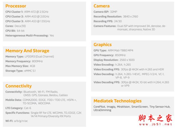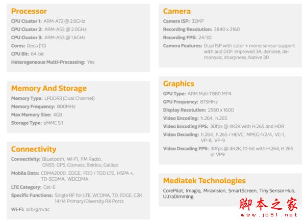 从联发科官网提供的 X27 和 X25 的信息中可以看出,在 CPU 方面,二者采用的都是「2 个 A72 大核 + 4 个高频 A53 中核 + 4 个低频 A53 小核」设计,共计 10 个核心,不过 X27 的大核最高 2.6GHz,小核最高 1.55 GHz,而 X25 分别是 2.5GHz 和 1.5GHz。GPU 方面,二者均为 Mali-T880 MP4,X27 最高主频 875MHz,X25 最高 850MHz。在存储上,X25 和 X27 最大都只能支持 4GB LPDDR3 以及 eMMC 5.1 存储(所以大家就不要抱怨为什么没 6GB 运存,没有 UFS 2.0 存储了)。