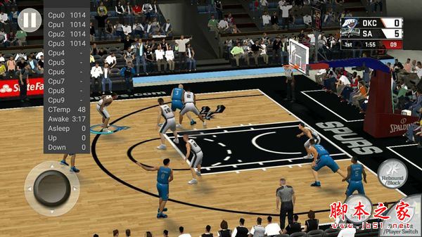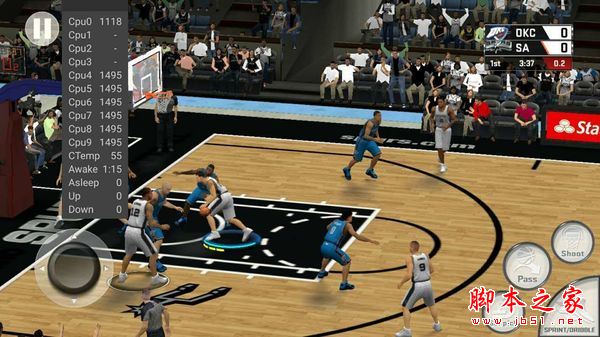 以 NBA 2K17 为例,在刚开始玩游戏的时候,Helio X27 的 4 个「中核」和 2 个「大核」还可以正常运行,游戏的流畅度也没什么问题(上图一),不过玩上三五分钟后,由于温度太高,就逐渐变成了多数时候只有 4 个「小核」在工作,出现了「4 小核有难,6 大核围观」的状况,与此同时,GPU 频率也会因为 SoC 温度的升高而降低,导致的结果游戏帧率明显下降,出现卡顿(上图二)。