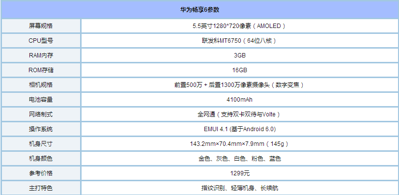 配置方面,华为畅享6采用了1.4GHz八核处理器,辅以3GB RAM+16GB ROM,支持最高128GB外置存储卡扩展,前置500万像素、后置1300万像素摄像头,该机内置4100mAh大电池,号称重度使用可用2天。另外该机采用micro USB接口,支持OTG反向充电,网络方面支持全网通3.0和双卡双待,运行基于安卓6.0的EMUI 4.1操作系统,另外该机还支持DIRAC音效。
