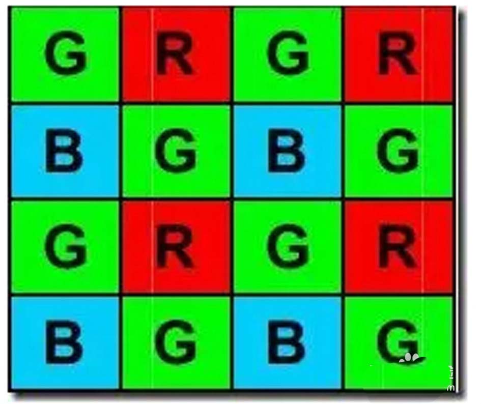 简单来说,我们手机的摄像头传感器一般采用的是RGB Bayer阵列的设计。如下图,只是COMS上有1200万个这样的像素点而已。在相机捕捉光线的时候,每个子像素记录一种色彩,再由后期合成,这样打散再合成的方式,就会浪费大量的光线,降低了感光性。同时解析度也下降了,比如记录单一红色的图案,解析度下降为原来的四分之一,绿色下降二分之一。