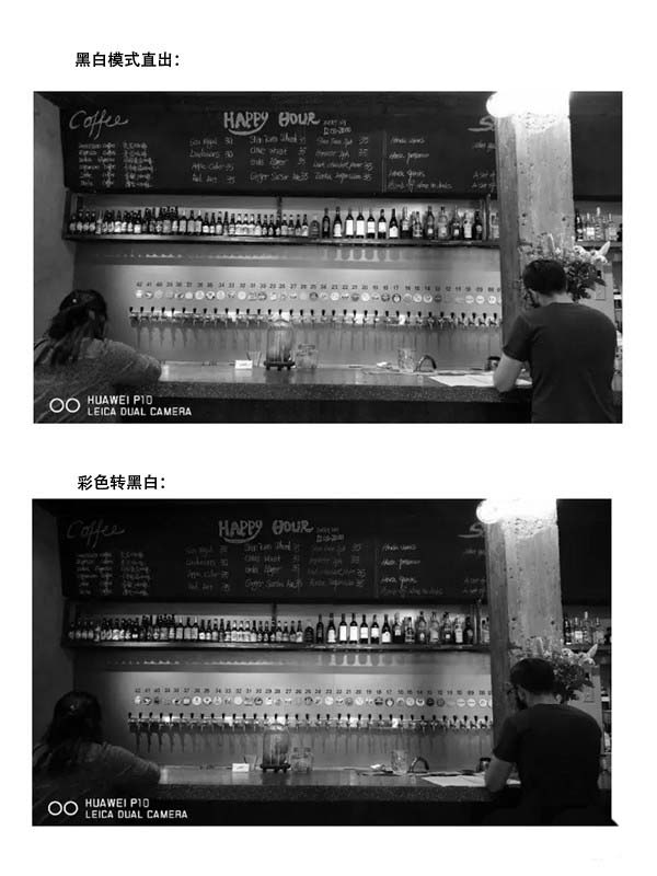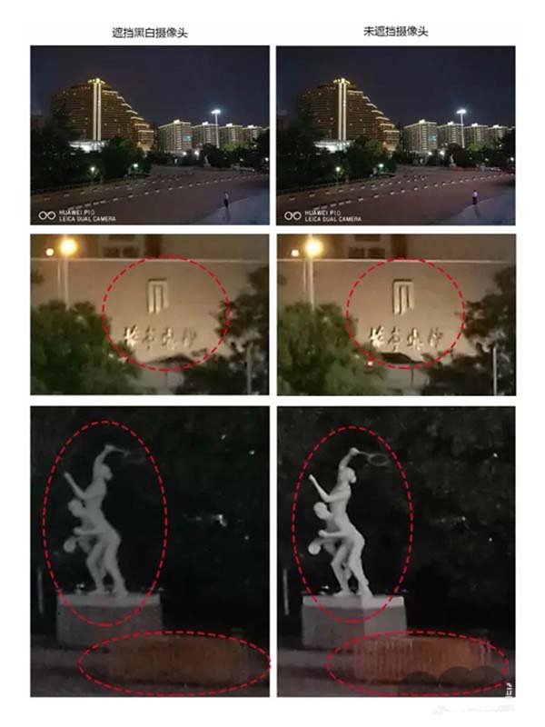 为了解决以上的问题,P10才设计加上了一颗黑白摄像头,采用了彩色+黑白双摄像头方案。彩色摄像头负责记录色彩信息;黑白摄像头可以用来记录高解析度的物体轮廓和细节。黑白摄像头由于没有色彩滤镜,其感光性能大幅提升,解析度也得到很大的提高。采用此方案,能发挥黑白、彩色两个摄像头各自的优势,获取到更好的拍照效果。