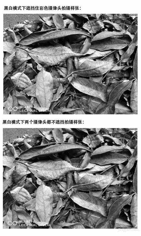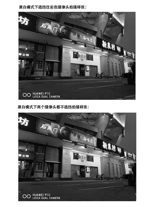 华为P10上有一个专门的拍照模式,叫做“黑白相机”模式。如同上面的步骤,我们分别遮挡两个镜头会发现什么呢?黑白模式下,遮挡黑白摄像头,拍出全黑照片