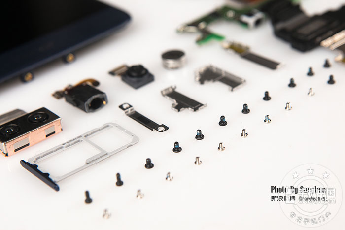 为了不影响手机的结构强度同时照顾到散热,荣耀V9采用一片金属钢板取代金属防滚滑架,使用两种长度不一的螺丝固定。