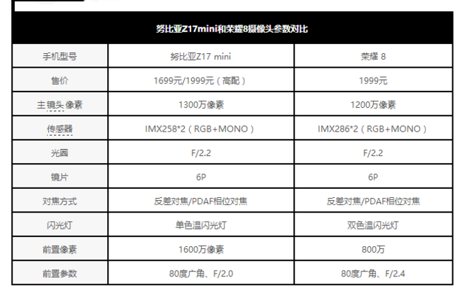 从相关参数我们可以看到,努比亚Z17mini与荣耀8两家都选用了索尼的传感器。除了在有效像素上努比亚Z17mini拥有100万像素的微弱优势之外,不管是在镜片设计还是光圈大小甚至是对焦方式都基本一致。而这两台手机都是采用了在业界相当出名的“黑彩”双摄方案,简单来讲就是一枚彩色传感器+一枚黑白传感器的真双摄方案。目前来看,努比亚Z17mini在参数上拥有微弱的优势。