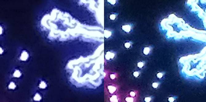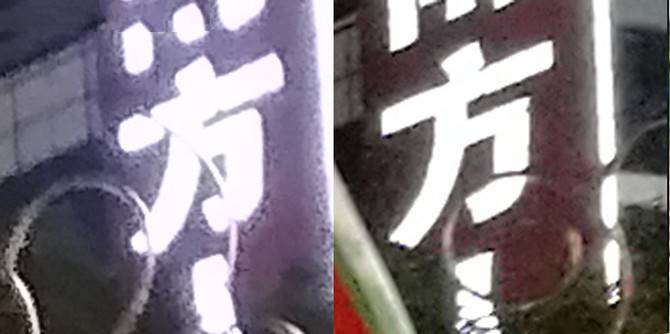而在夜间大场景的样张对比中,二者的整体画面都相当不错,努比亚Z17mini的画面要更贴近人眼。但在细节图中努比亚Z17mini就出现了一些问题,可以看到努比亚Z17mini的抗眩光能力比起荣耀8仍旧有一些差距,出现略微过曝现象。