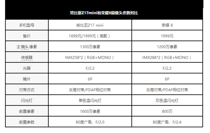 从相关参数我们可以看到,努比亚Z17mini与荣耀8两家都选用了索尼的传感器。除了在有效像素上努比亚Z17mini拥有100万像素的微弱优势之外,不管是在镜片设计还是光圈大小甚至是对焦方式都基本一致。而这两台手机都是采用了在业界相当出名的“黑彩”双摄方案,简单来讲就是一枚彩色传感器+一枚黑白传感器的真双摄方案。目前来看,努比亚Z17mini在参数上拥有微弱的优势。