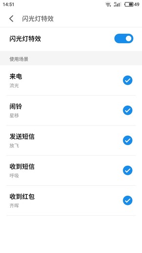 有意思的是,魅族还为闪光灯赋予了新的功能。在系统中通过定制亮闪效果,可在来电、闹钟、收发短信、微信红包时呈现不同的亮起状态。比如来电时:流光(跑马灯式不停闪烁);闹钟时:星移(跑马灯式来回不停闪烁);收到红包:齐晖(闪光灯全亮,2次)等。