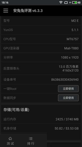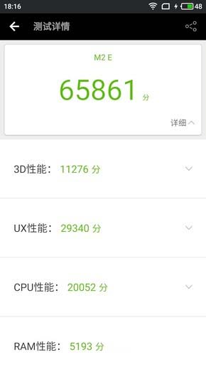 使用大家喜闻乐见的安兔兔软件给魅蓝E2进行性能测试,最终成绩为65861分,整体符合预期。如果你平时对手机的性能要求不是非常高,那么魅蓝E2完全可以满足需求。实际测试下来,《王者荣耀》这类热门手游,在高清画质下基本可以流畅带动。