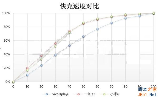 经测试,虽然三台手机的快充方案、电池容量都各有差异,但是都不约而同地在100分钟时就完成了充电。但从绝对的充电速度来看,vivo Xplay6显然是最快的,毕竟它拥有三台手机中最大的4000mAh电池。而在前30分钟时间内,一加3T的充电速度是最为迅猛的,紧随其后的是小米6,但是这两台手机都在充电的后期明显变慢;vivo Xplay6则是前后的充电速度都较为均匀。