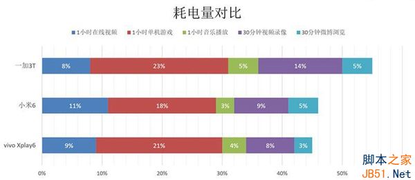 30分钟视频录像耗电量:Xplay6(8%)、一加3T(14%)、小米6(9%)