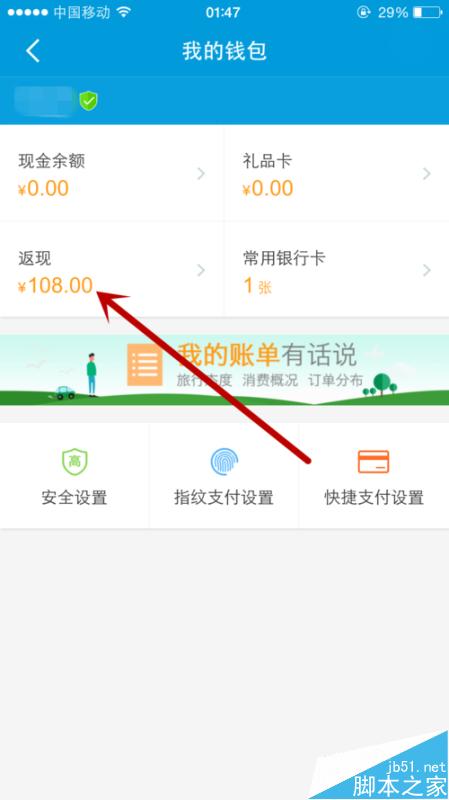 3、此时小编已经登录了自己的账号,然后我们点击我的钱包下方的“返现”,如图示,小编有108元的返现金额;