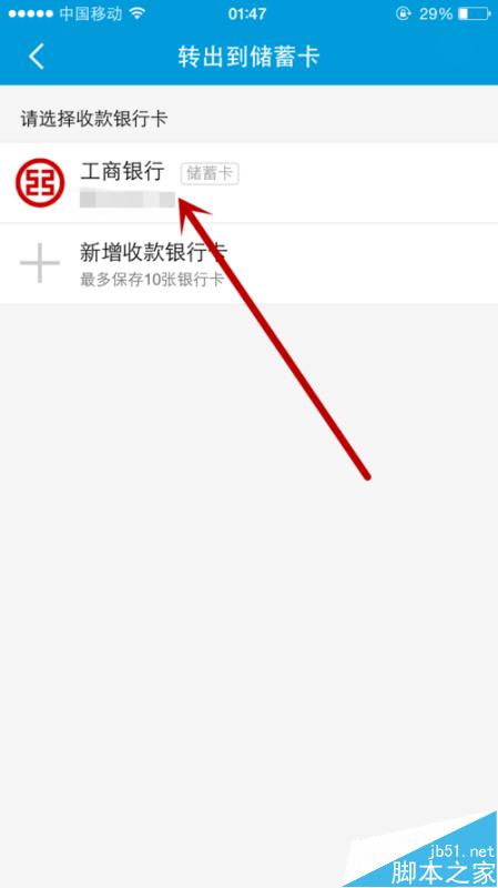 6、接着提示我们转出到储蓄卡,提示我们选择银行卡,因为小编已经添加过银行卡,所以这里可以直接选择,或者也可以点击新增银行卡来添加新卡,点击自己的储蓄卡;