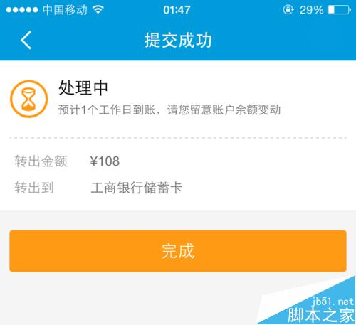 9、最后就弹出了提交成功的提示,提示我们预计一个工作日到账,我们点击完成等待到账即可。