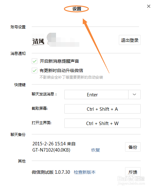 4、然后我们可以在电脑端微信的左下角看到一个设置图标,我们点击它;接着就会弹出设置窗口,如图