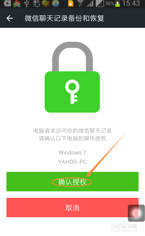 6、同样需要在手机端点击确认一下,授权成功以后,在电脑端点击”备份“,几秒钟时间也备份成功了,以后一旦误删了消息记录,在备份的文件后面点击”恢复“即可