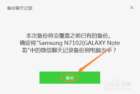 5、在该窗口的下方有一项”聊天备份“,我们点击右下角的”备份“,然后务必确保此时手机和电脑是通过数据线连接的,否则无法备份的;