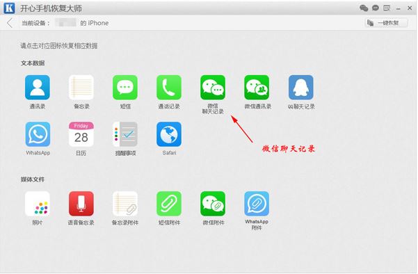 方法二:我们还可以借助专业的数据备份恢复软件来讲微信聊天记录备份到电脑上,也是是十分简单方便的。开心手机恢复大师就可以做到,我们只需要将开心手机恢复大师(官网:http://www.kxbox.com/)下载安装到电脑上,然后点击“开始”,选择“微信聊天记录”进入扫描,扫描完之后选择想要备份的微信聊天记录,点击“恢复到电脑”就可以了。