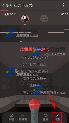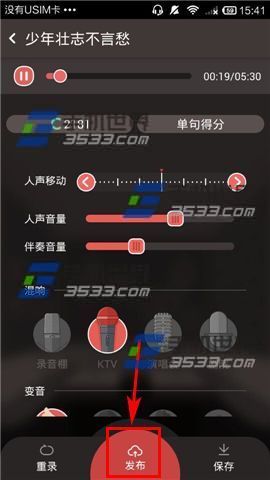 3)唱完后点击【结束】,等待评分完成,进行调试,最后即可【发布】。(如下图)