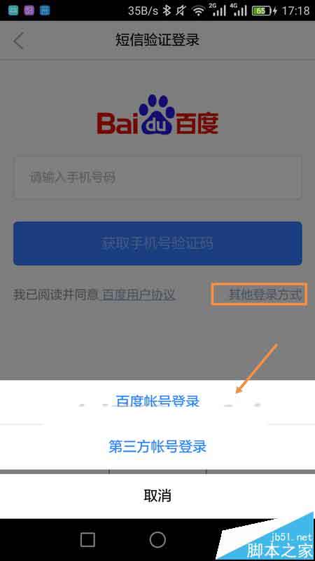 3、如果没有通过手机号注册的话,可用其他登录方式,再选择 百度帐号登录,