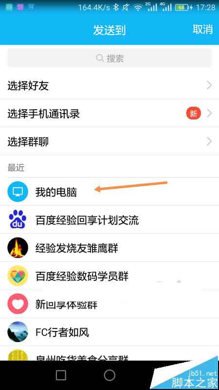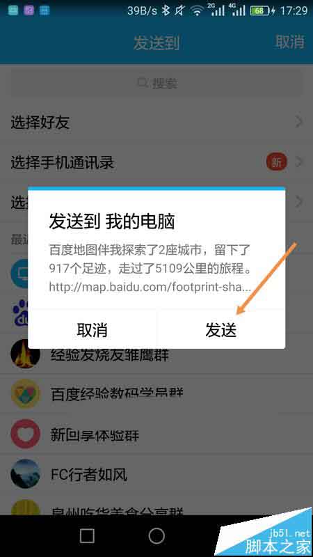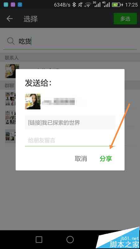 8、在打开的微信好友列表中,选择一个好友后,点击分享,