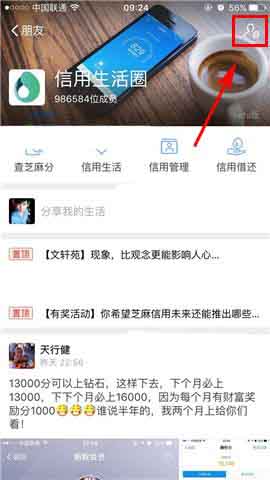 1)首先我们先打开【支付宝】,然后来到【朋友】的界面找到【信用生活圈】并点击,打开后我们再点击右上角的【设置】。(如下图)