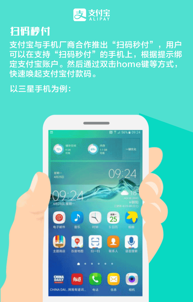 “支付宝”与手机厂商合作推出“扫码秒付”,用户可以在支持“扫码秒付”的手机上,根据提示绑定“支付宝”账户。然后,通过双击home键方式,快速唤起支付宝付款码。