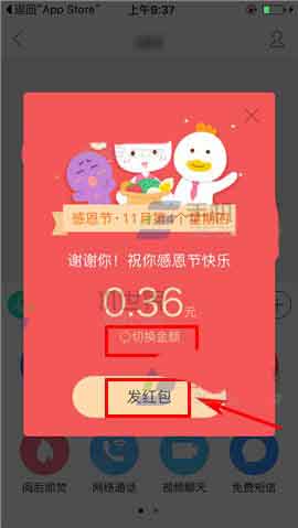 3)然后选择【感恩节红包】,随后切换金额,确认后点击【发红包】即可塞钱进红包发送出去啦~(如下图)