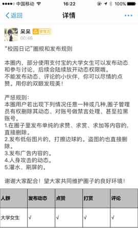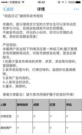 目前,支付宝已经公布了“校园日记”的圈规和发布规则,新规显示,单纯的求赞、求赏、求加等内容的,直接删除。此外,对于发布低俗图片的,打擦边球或者盗图的,支付宝也会直接删除。