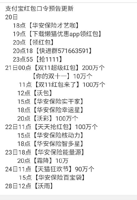 以上就是2016双十一支付宝红包口令,2016双十一支付宝红包口令汇总。希望对大家有所帮助。