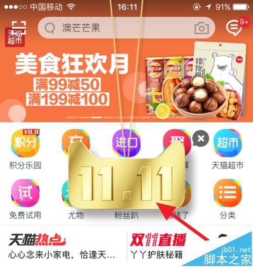 1、打开天猫APP,点击金色猫图标,或者点击滚动屏的【双11来啦】