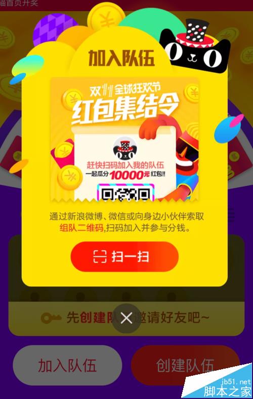 3、活动主要是根据以往双十一的消费情况,拉好友组成队伍,达到一定金额后,可以瓜分红包,人越少,金额越高,得到的红包也就越多,注意是以前每一年双十一的消费总金额,如果以前双十一没消费过,无法参加这个活动