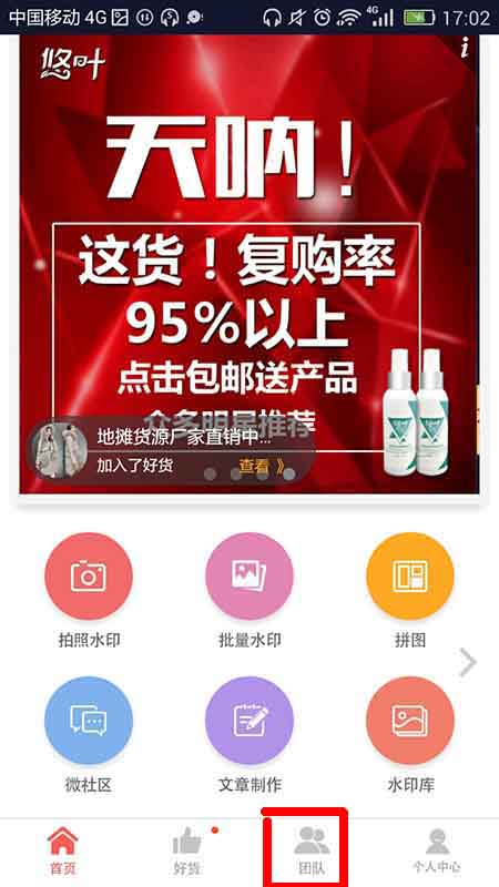 1、下载微商水印相机app软件,并打开,在下面可以看到“团队”选项,如下图所示。